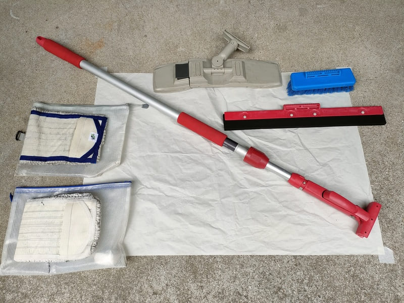 モップやブラシを何本も持って歩かないで済むように、先だけ取り換え式のモップを使用します。最低必要なのはワックスモップ2枚です(写真左)。1枚は水拭き用に使用し、1枚はワックス塗布に使用します。※上段中央がモップ用