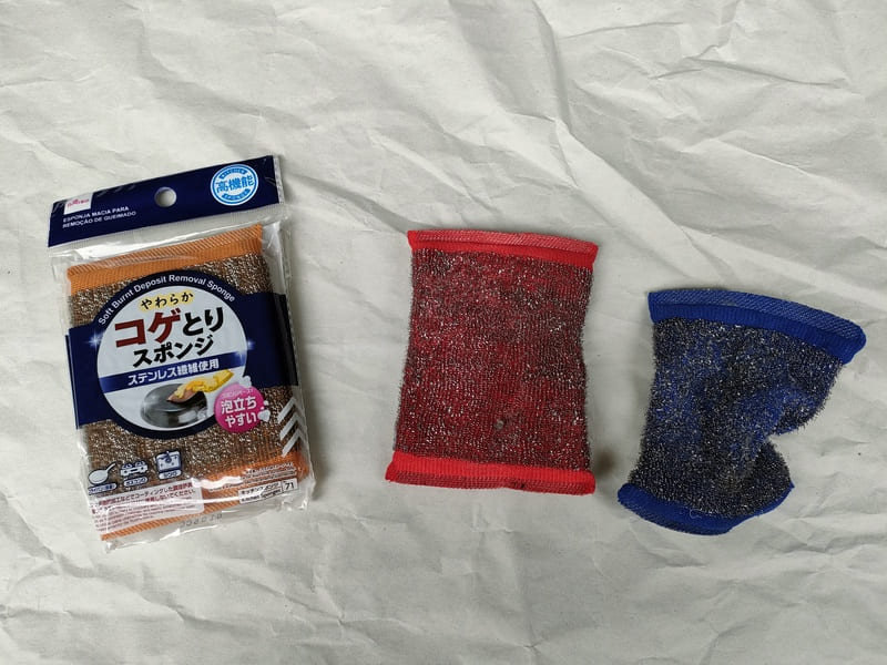 100均のステンレスの入った焦げ取りスポンジは必須ですし、これだけでほとんどの作業が出来ます。私は常に10個以上の在庫を持ってます。一応色によって使用場所を決めておくと在宅でトラブルを防げます。キッチンシンクとトイレを同じスポンジを使用してたら・・・です。