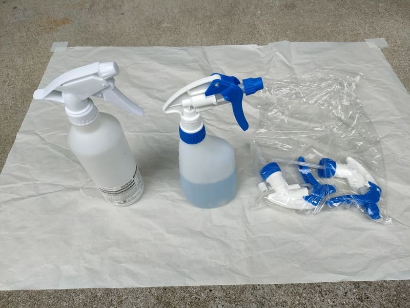 最初は100均の詰め替えスプレーで大丈夫です。容器部分が柔らかくペコペコするのはよしましょう。スプレー部分の耐久性に難があるので予備も用意しておきましょう。おすすめはキャニヨンスプレーです。使いやすいし耐久性もあります。薬品毎に必要です。